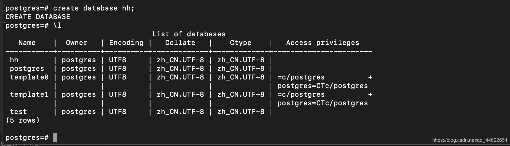 | 5. 终端使用 \l 查看database create database hh;
